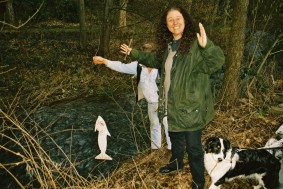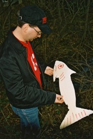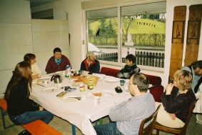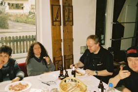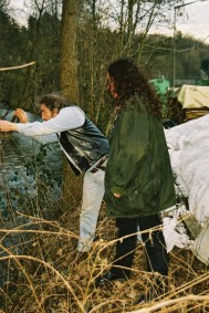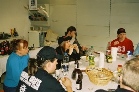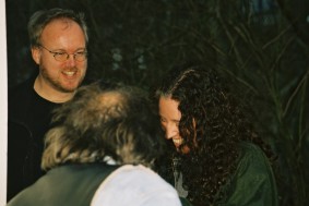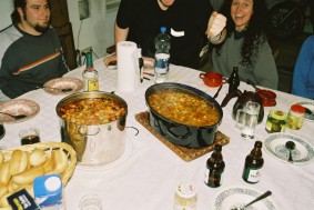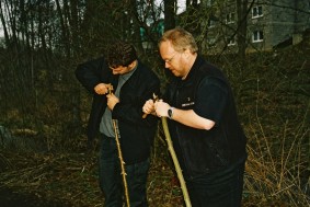 Anschließend bemühten sich Mike und ich, aus Linewolfs Stöcken Pfeil und Bogen zu schnitzen. Dank der tätigen Mithilfe des alten Einzelkämpfers wurden daraus ansehnliche Waffen. Als Probeschuss erlegte gleich die Vierbuchen'sche Gästetoilette. Mike glänzte gleich mit seinem ersten Schuss auf den großen Weißen Tahasen und erlegte ihn mit einem Treffen mitten in den Bauch. Mein glatter Ohrdurchschuss gab dem Vieh dann den Rest. Da anständige Jäger so was natürlich nicht roh verzehren wollen, war die nächste Aufgabe, ein Feuer ohne moderne Hilfsmittel zu erzeugen. Mikes Konstruktion konnte sich sehen lassen, aber da wir ihn nicht für den Rest des Tages am Holzklotz reibend stehen lassen wollten, wurde doch lieber auf das Gulasch und die Soljanka, die Katrin in unserer Abwesenheit zubereitet hatte, als Abendessen zurückgegriffen. Wäre interessant gewesen, wie sich die Pilze, die Linewolf fürs Anzünden bereitgelegt hatte, im Essen gemacht hätten. War auch ohne lecker.